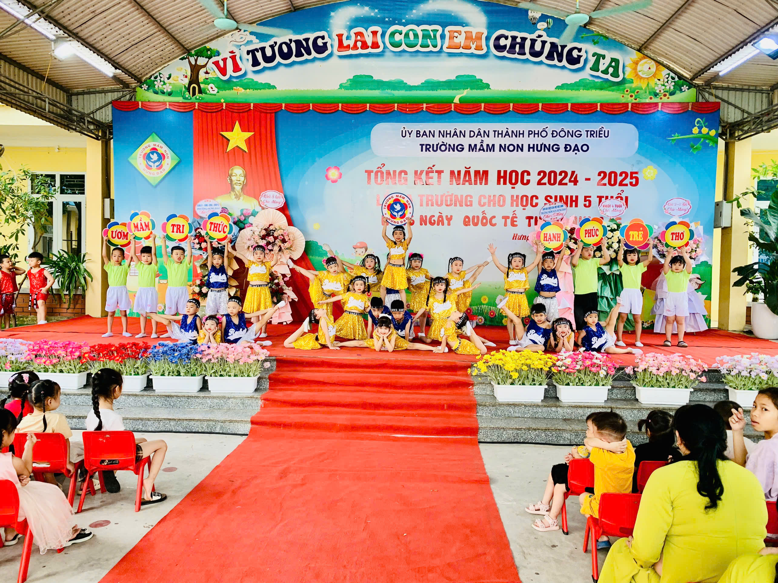 Thực hiện Kế hoạch năm học 2024 - 2025 của trường mầm non Hưng Đạo. Thực hiện sự chỉ đạo của phòng GD&ĐT thành phố Đông Triều. Được sự nhất trí của Đảng ủy- UBND phường Hưng Đạo. Hôm nay ngày 28/05/2025 trường MN Hưng Đạo long trọng tổ chức "Lễ tổng kết năm học 2024-2025 và ra trường cho các bé 5...