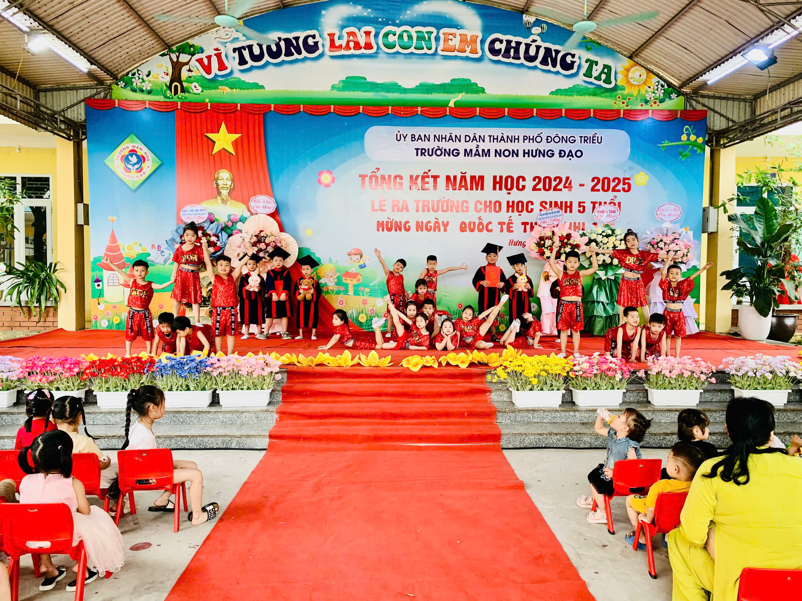 Thực hiện Kế hoạch năm học 2024 - 2025 của trường mầm non Hưng Đạo. Thực hiện sự chỉ đạo của phòng GD&ĐT thành phố Đông Triều. Được sự nhất trí của Đảng ủy- UBND phường Hưng Đạo. Hôm nay ngày 28/05/2025 trường MN Hưng Đạo long trọng tổ chức "Lễ tổng kết năm học 2024-2025 và ra trường cho các bé 5...