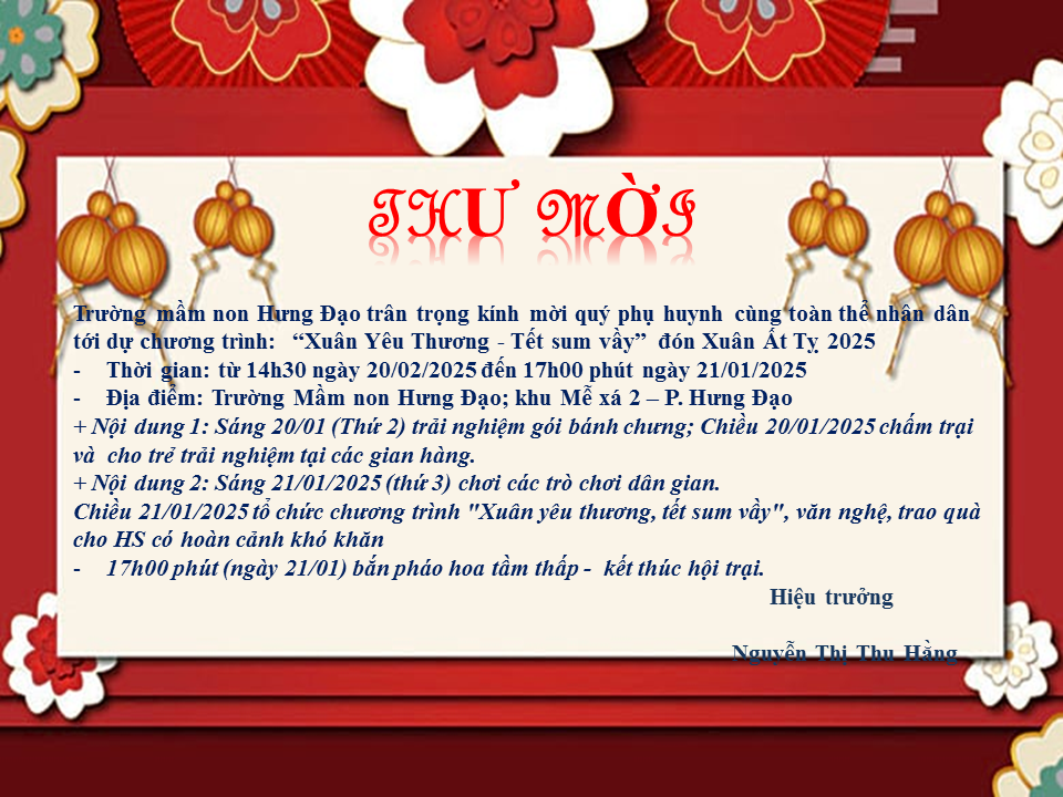 Trường mầm non Hưng Đạo trân trọng kính mời quý phụ huynh cùng toàn thể nhân dân tới dự chương trình: "Xuân yêu thương - Tết sum vầy" đón Xuân Ất Tỵ 2025