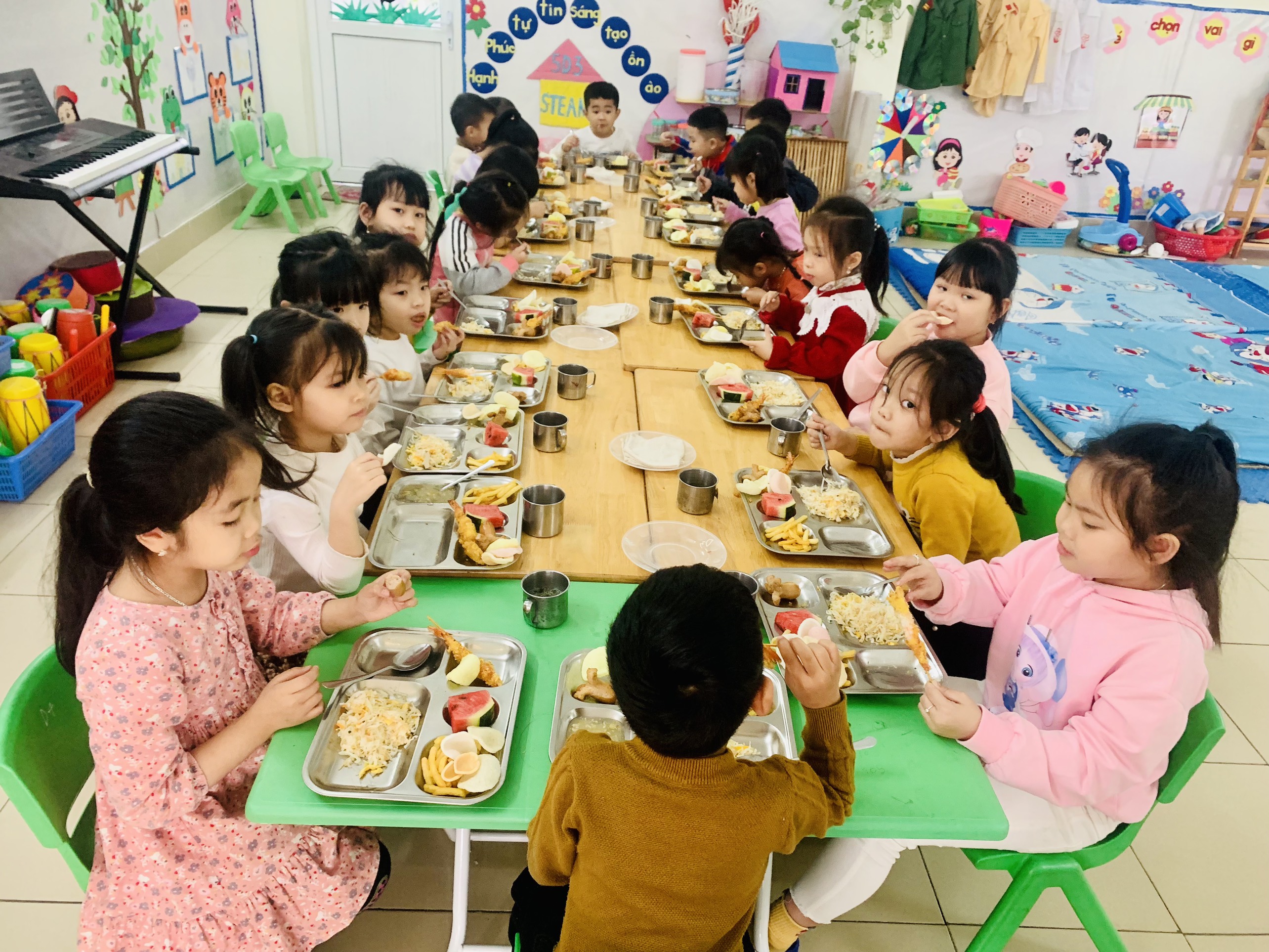 Trường MN Hưng Đạo tổ chức cho trẻ ăn tiệc Buffet.