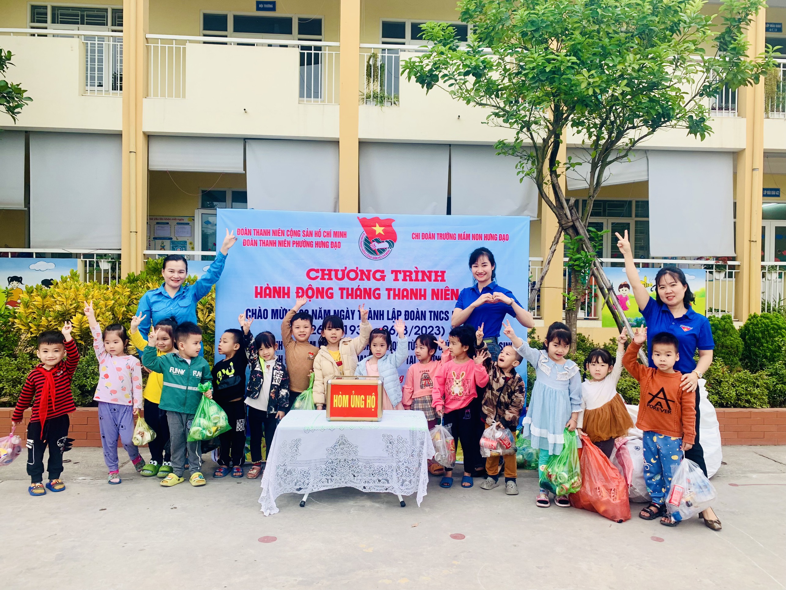 Nhân dịp kỉ niệm 92 năm ngày TL ĐTNCS Hồ Chí Minh(26/03/1931-26/03/2023), chi đoàn trường MN Hưng Đạo tổ chức hoạt động "thu gom vật liệu tái chế để đổi thành quà tặng cho các con học sinh có hoàn cảnh đặc biệt khó khăn đang học tập tại trường MN Hưng Đạo